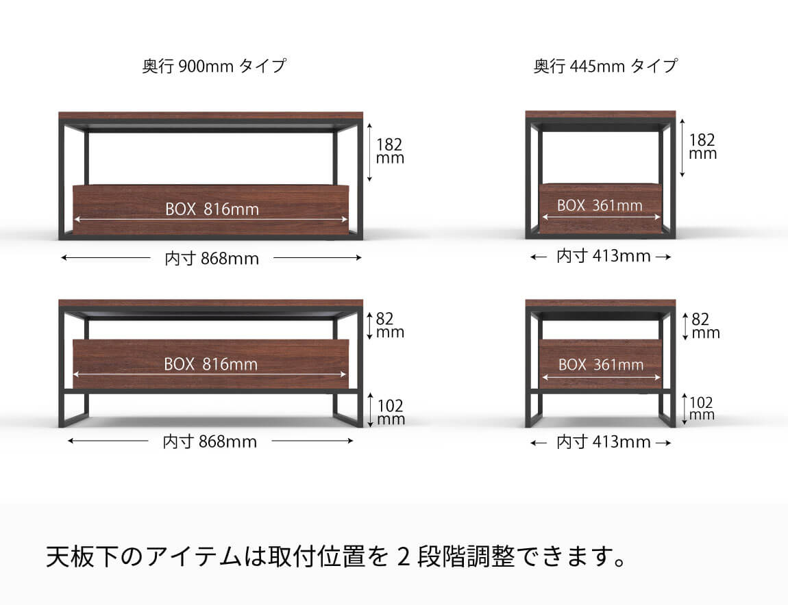 奥行90cmタイプでは、前方と後方で違うタイプの収納(引出収納・フラップ扉収納)を採用。使い勝手のいい収納BOXとなっています。