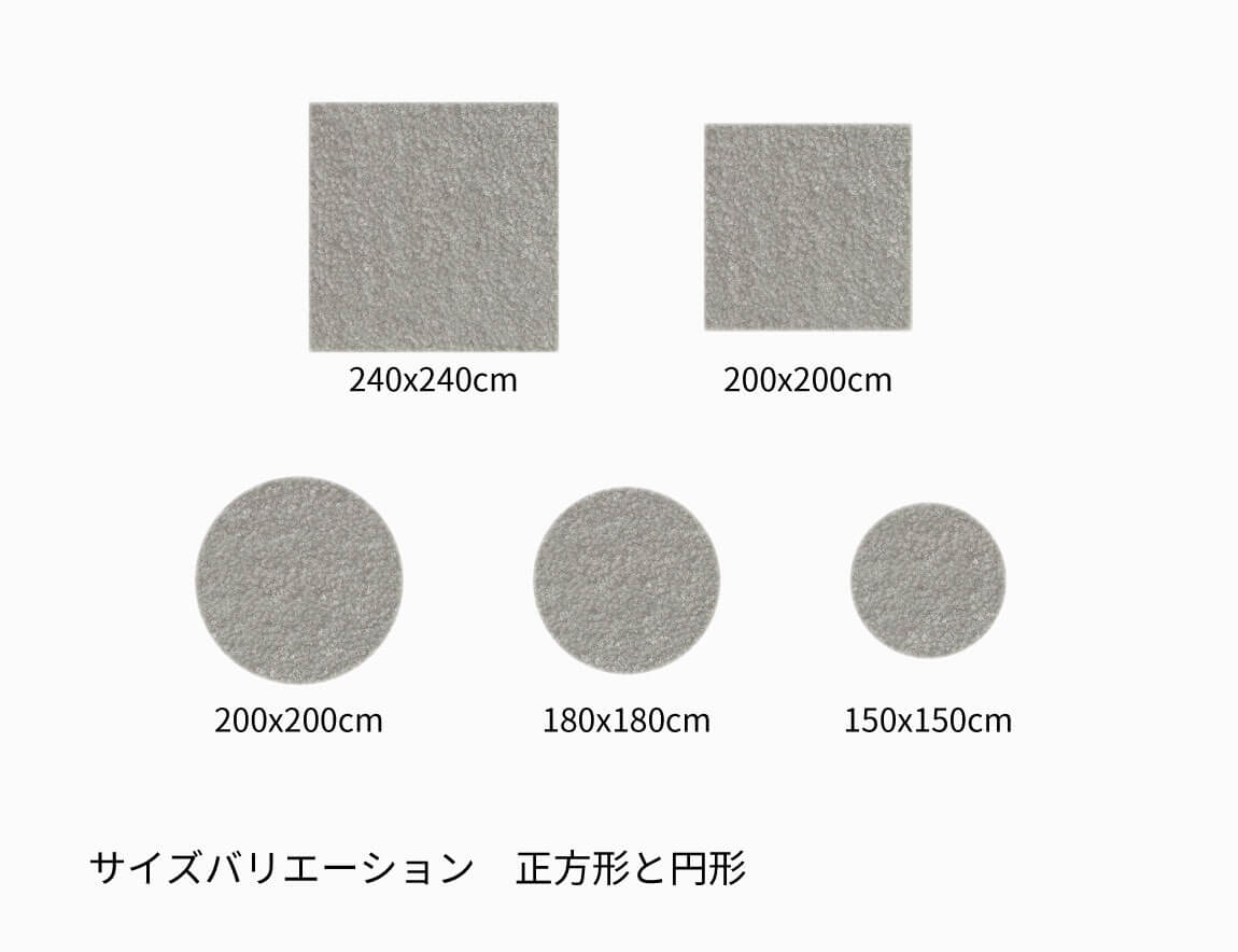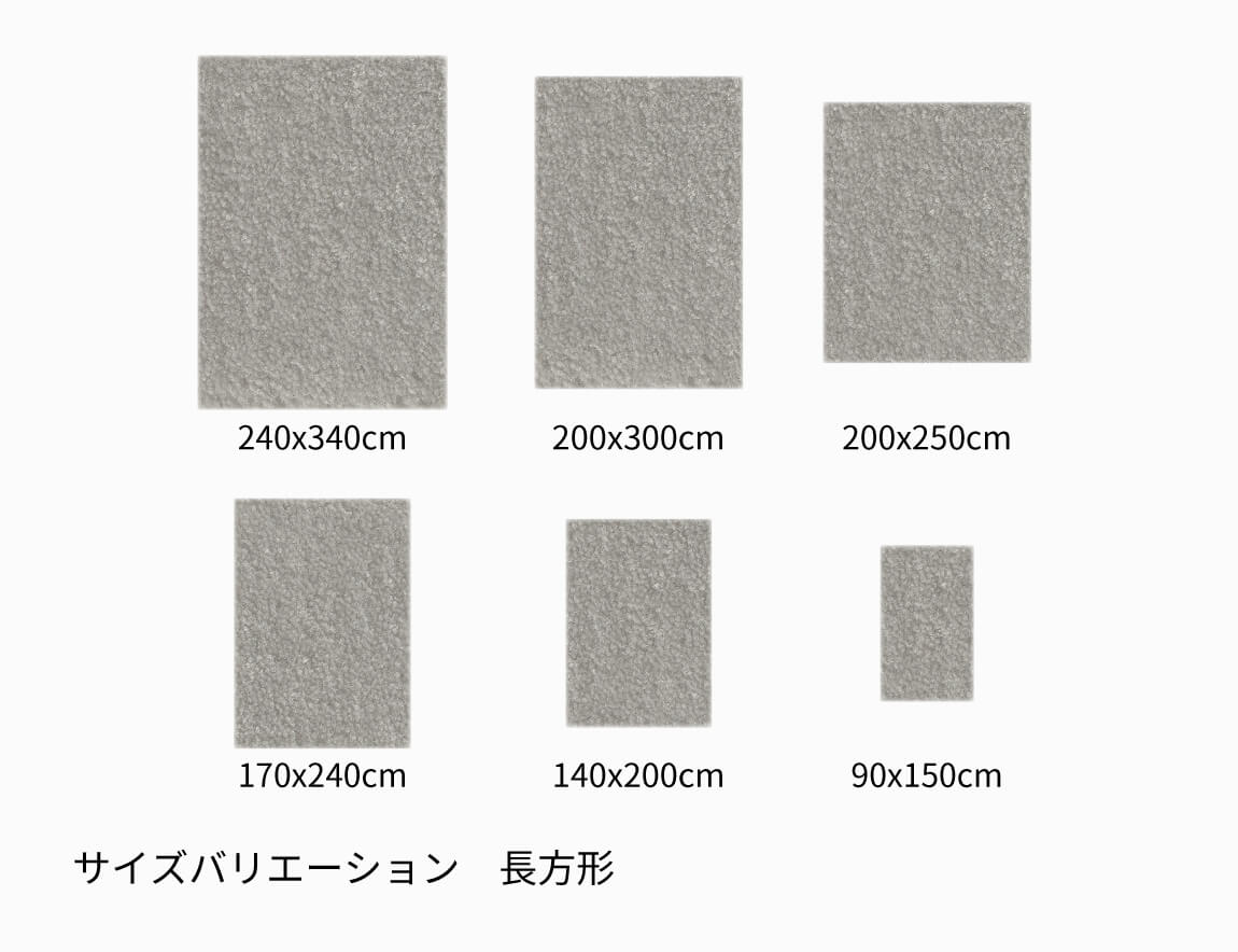 幅240×奥行340cm、幅200×奥行300cm、幅200×奥行250cm、幅170×奥行240cm、幅140×奥行200cm、幅90×奥行150cm