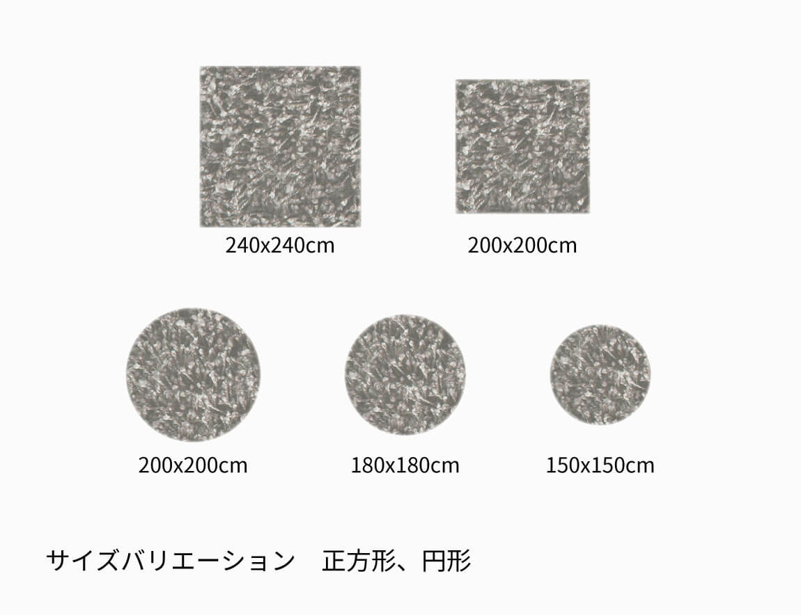 幅240×奥行340cm、幅200×奥行300cm、幅200×奥行250cm、幅170×奥行240cm、幅140×奥行200cm、幅90×奥行150cm
