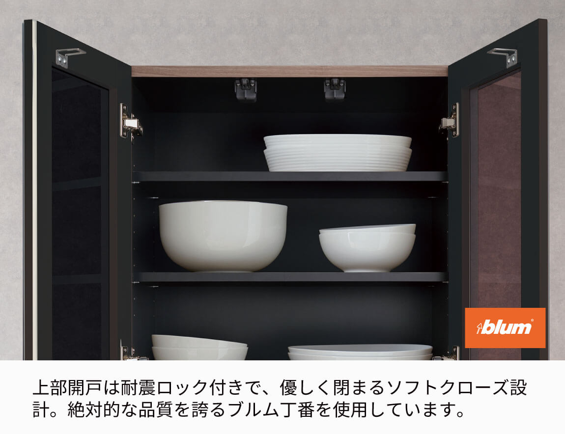 耐震ロック付で優しくしまるソフトクローズ。高い品質を誇るブルム丁番を採用しています。