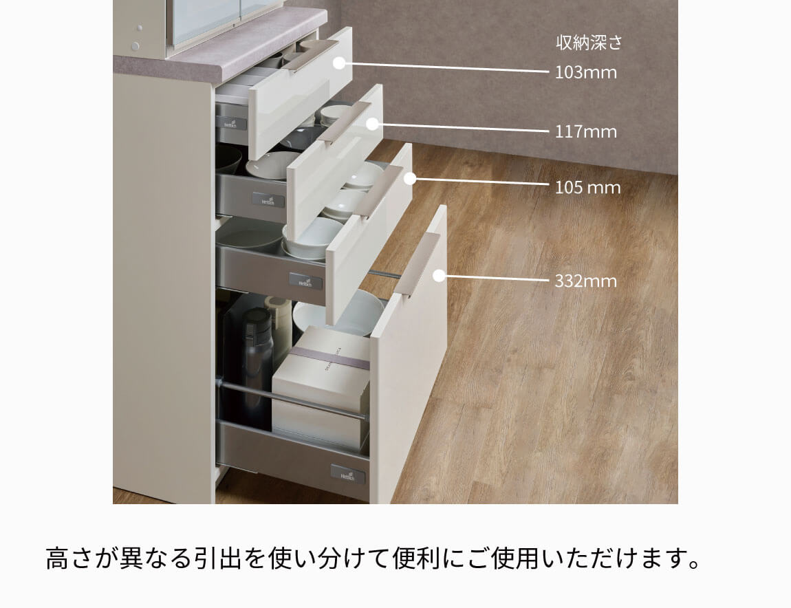 高さの異なる引出を使い分けて、便利にご使用いただけます。