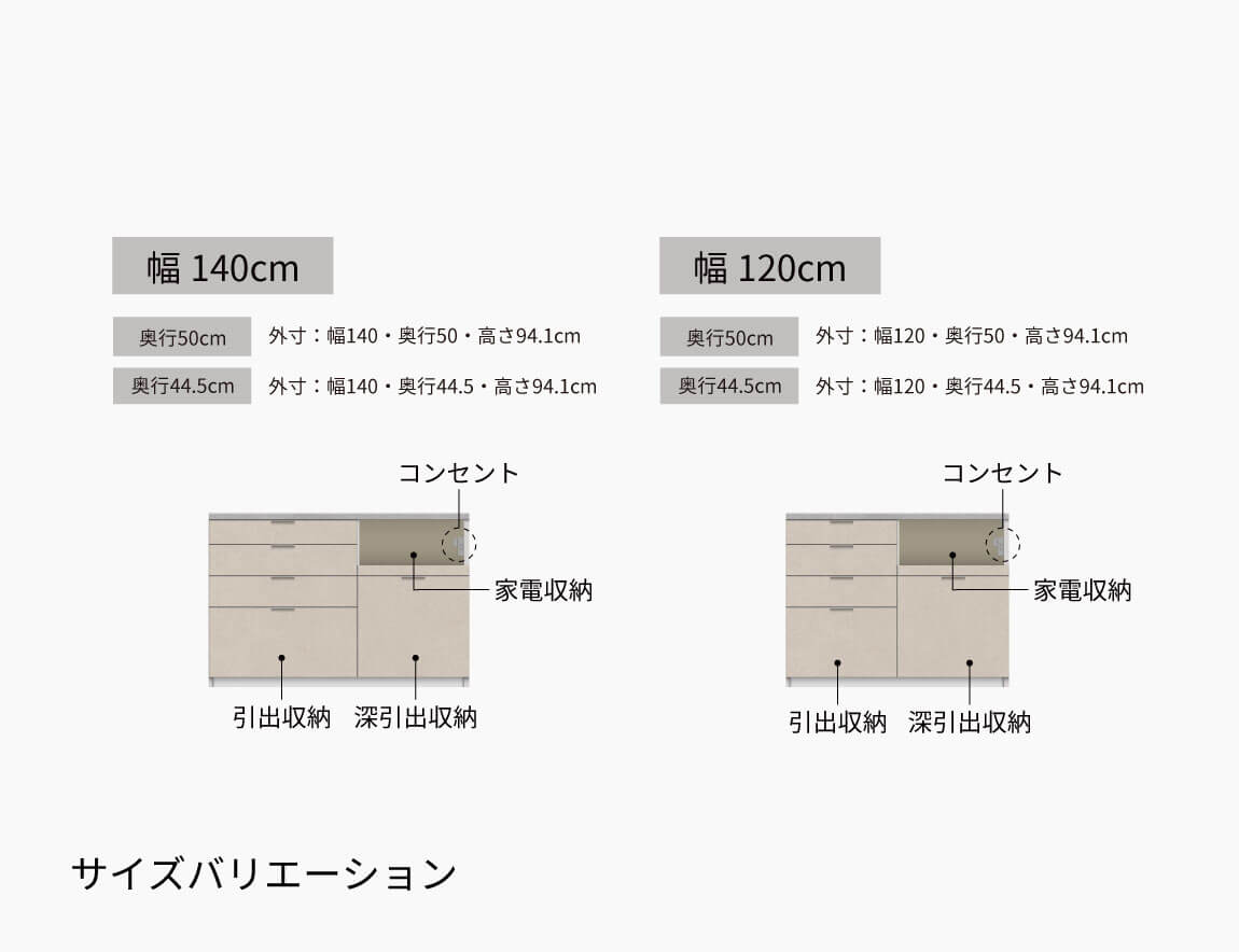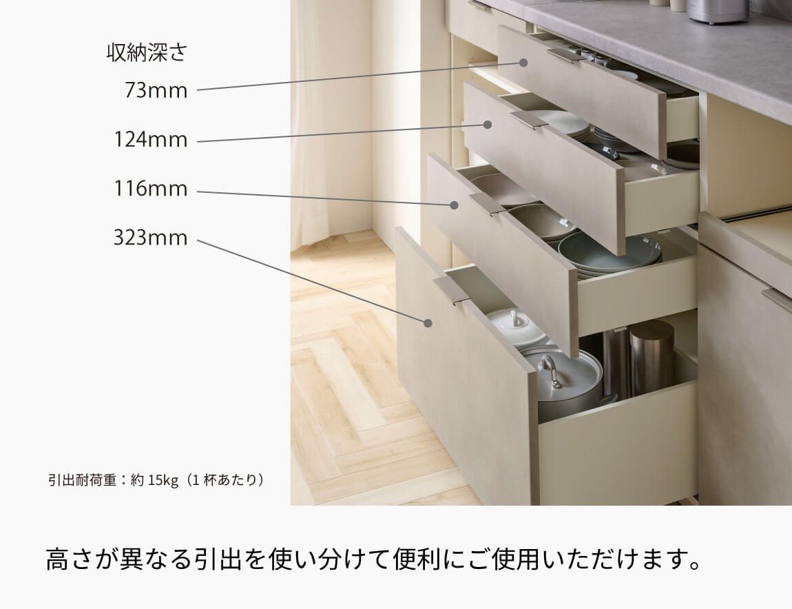 高さが異なる大中小の引出は収納の使い分けがしやすく、広く引き出せるので、奥の収納物まで見渡せます。