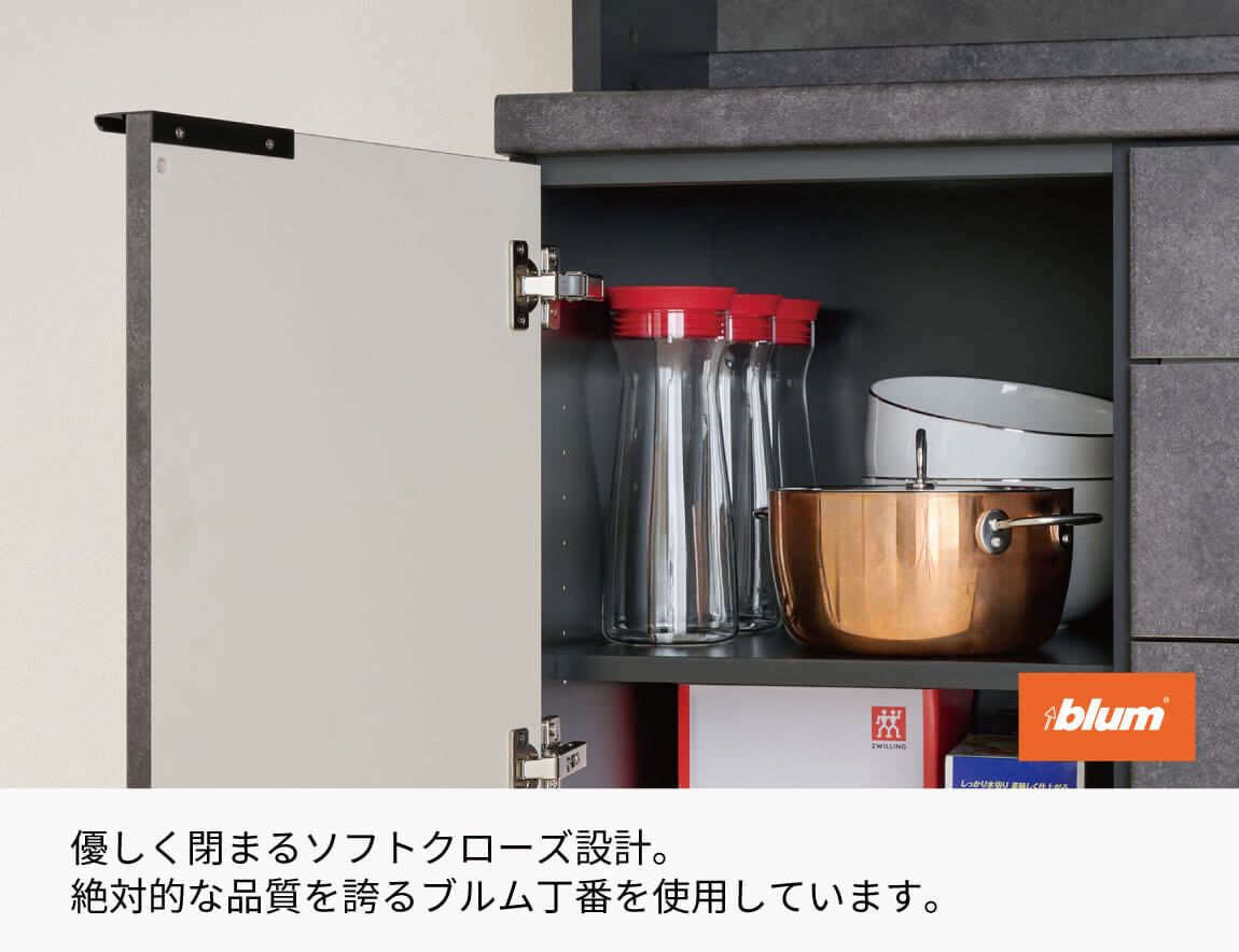 扉部は優しく閉まるソフトクローズ設計。絶対的な品質を誇るブルム丁番を使用しています。(幅160cm・幅180cmのみ)