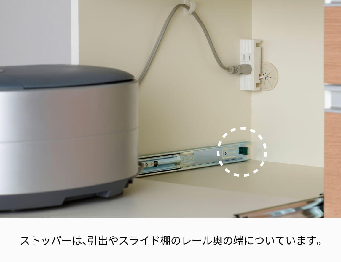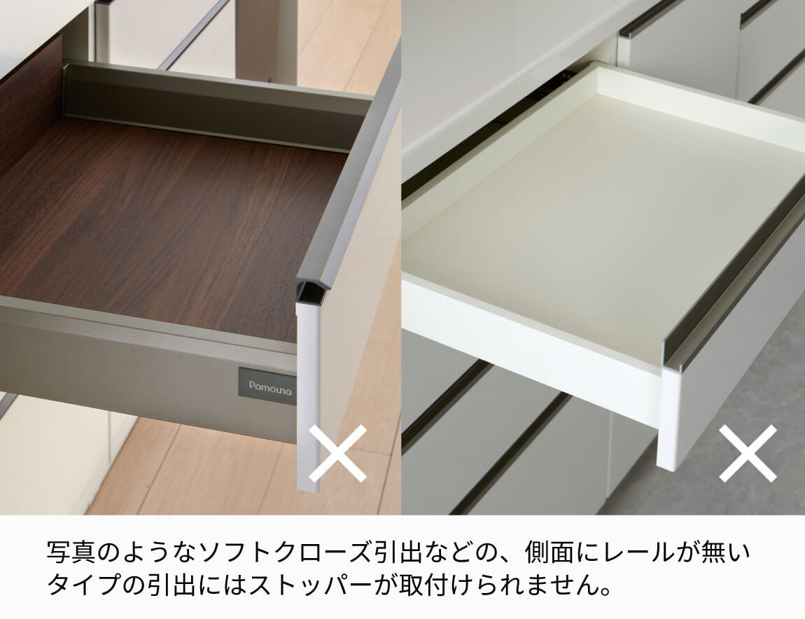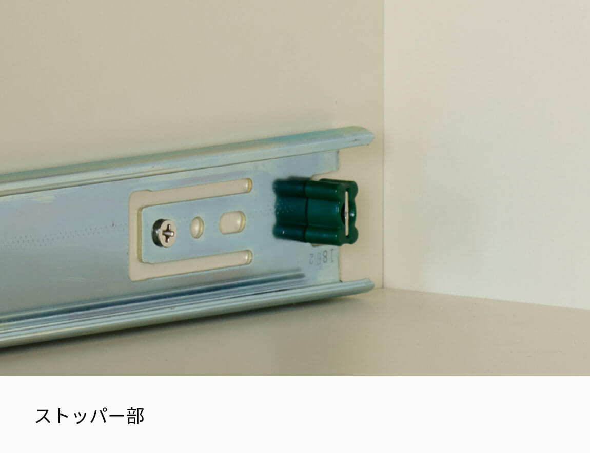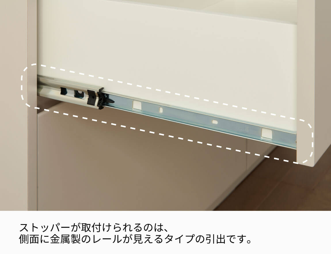 ・ご使用中の引出レール奥にあるストッパーを確認の上、破損や紛失している場合は当製品をご使用ください。