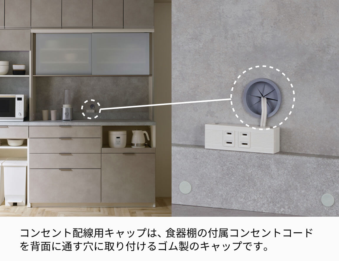 ・食器棚の背面にあるコンセントコード用の穴に取り付けるゴム製キャップです。経年劣化や破損した場合の交換部品としてご使用ください。