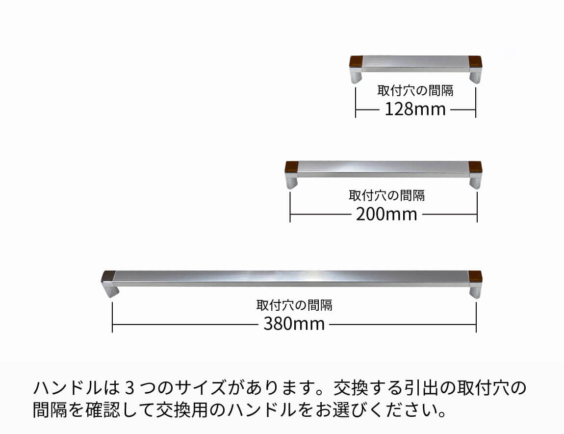 ・交換用ハンドルはネジ穴のピッチの長さが異なる3サイズ(128mm、200mm、380mm)を用意しています。ご使用中の食器棚のハンドルをご確認いただきお選びください。