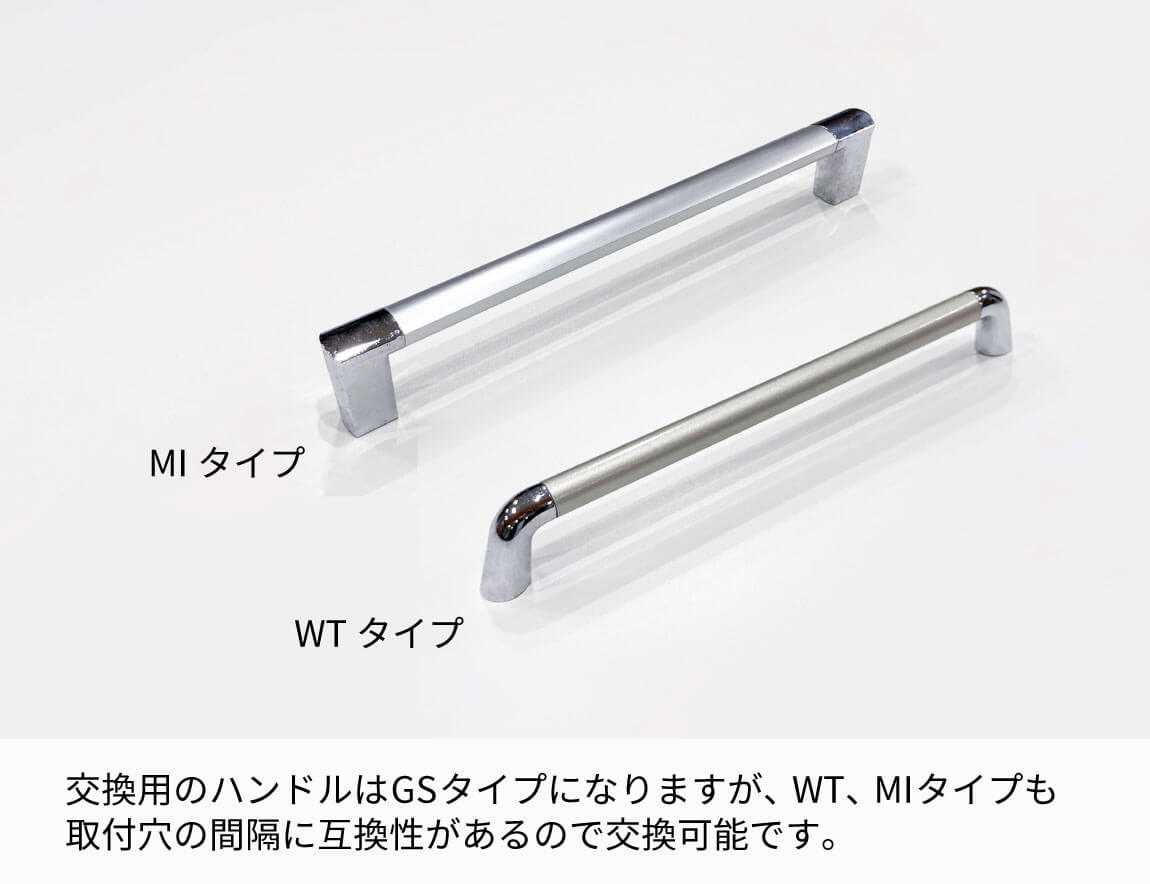 ・GSタイプのハンドルは、形状の異なるWTとMIシリーズに互換性があり、そちらも部品交換が可能です。