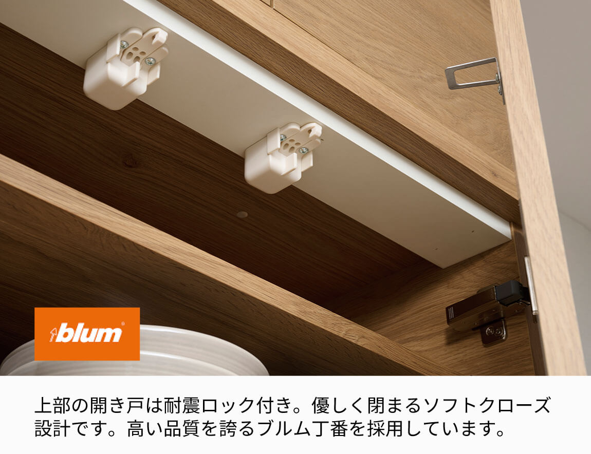 優しく閉まるソフトクローズ機能と耐震ロック付き。高い品質を誇るブルム丁番を採用しています。