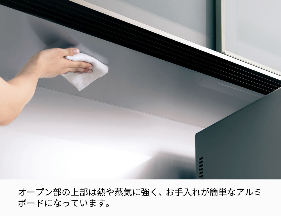 ゆとりのある高さ、55cmの上台オープン部はマグネットが取り付けられるスチールバックパネル仕様になっています。