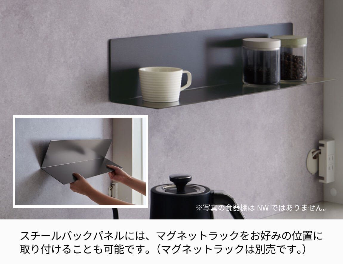 スチールバックパネルに設置できるマグネット仕様のオプション棚としてマグネットラックを別途お求めいただけます。