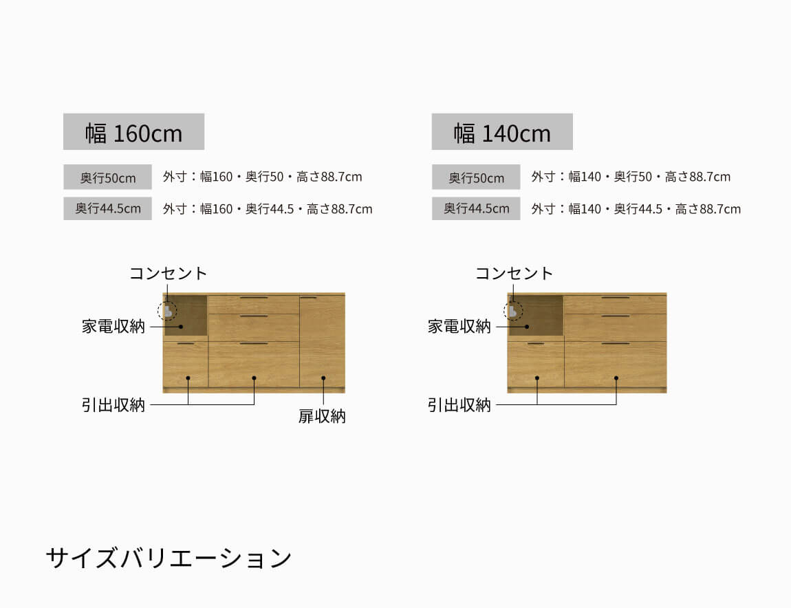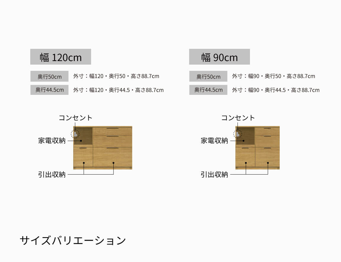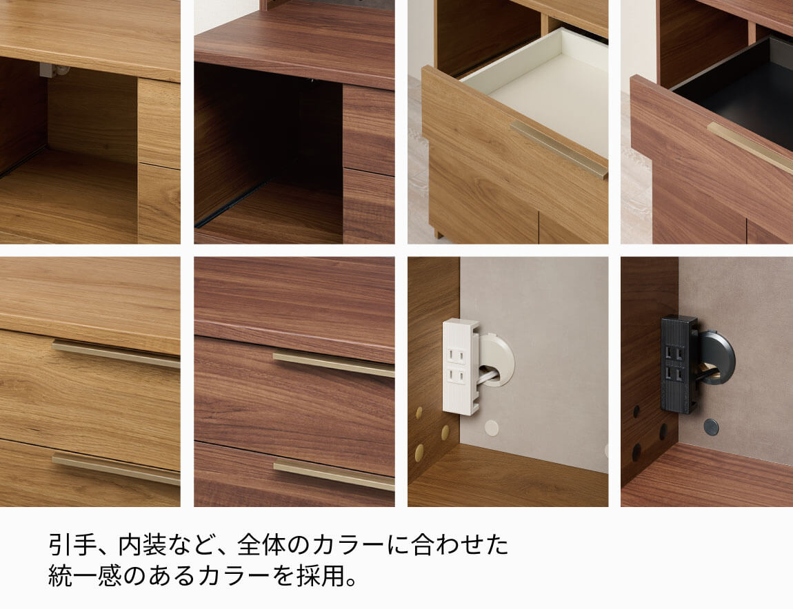 高さが異なる大中小の引出は収納の使い分けがしやすく、食器類から調理道具、ストック品まで様々なアイテムの収納に対応できます。
