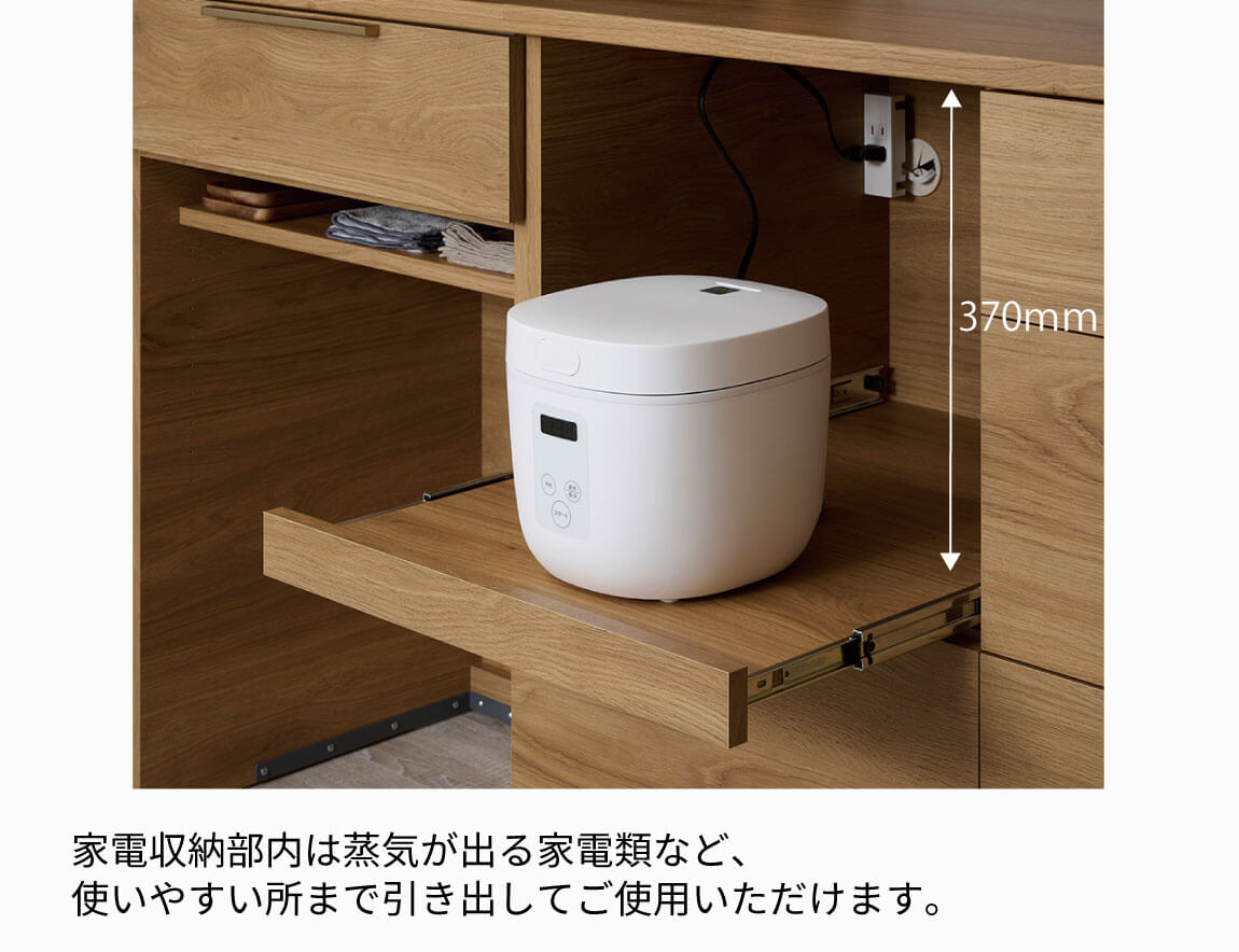 スライドテーブルになっているので、炊飯器などの蒸気の出る家電類を使いやすいところまで引き出してご使用いただけます。