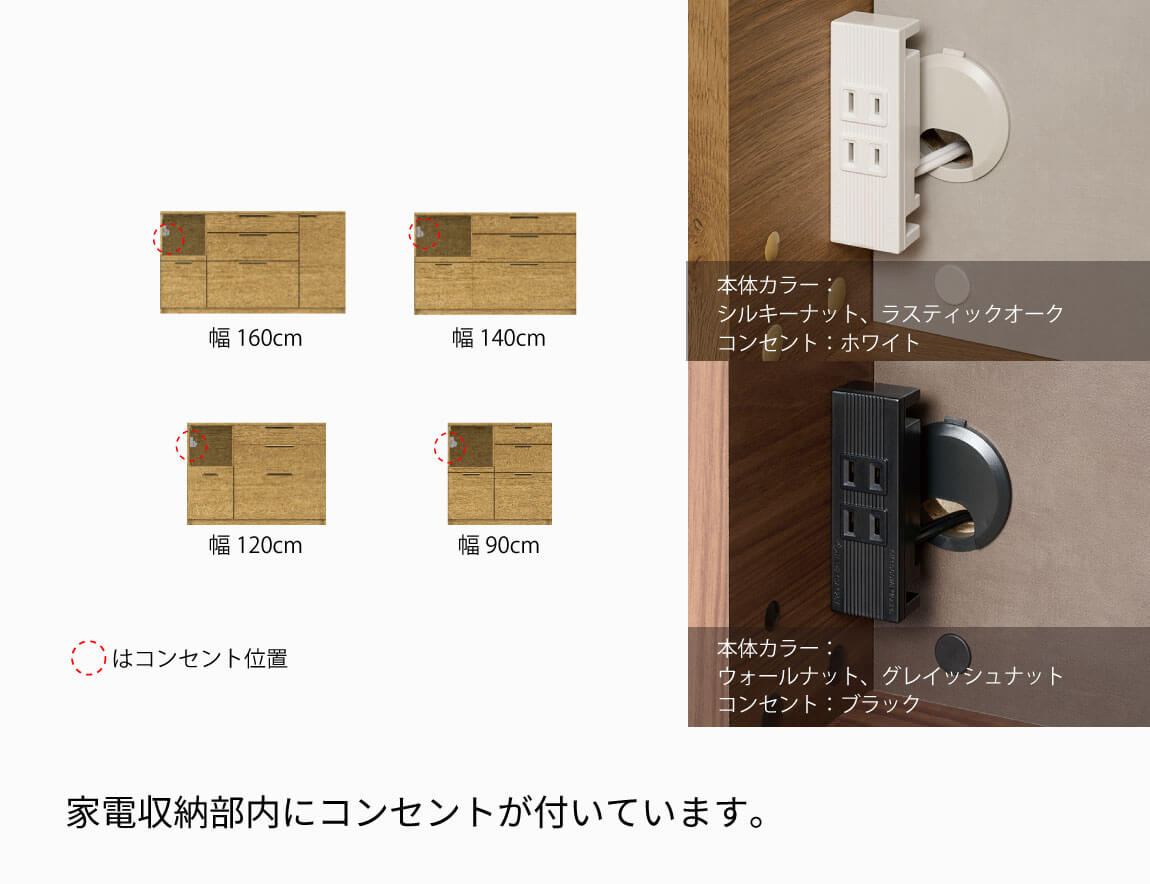 収納内部側面にはコンセントフックも付いていますので、コード配線が邪魔になりません。