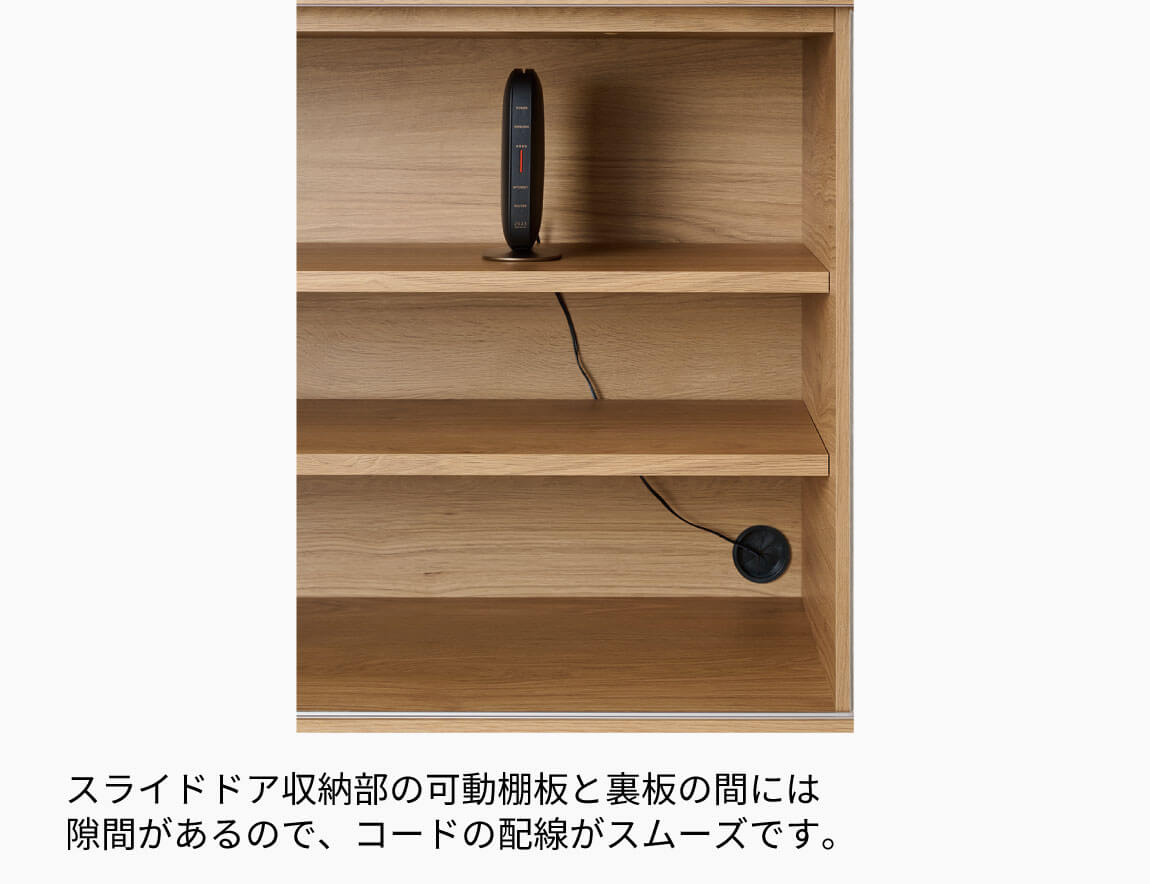 収納部の可動棚と裏板の間には隙間があり、さらに裏板にはコード穴が設けられています。