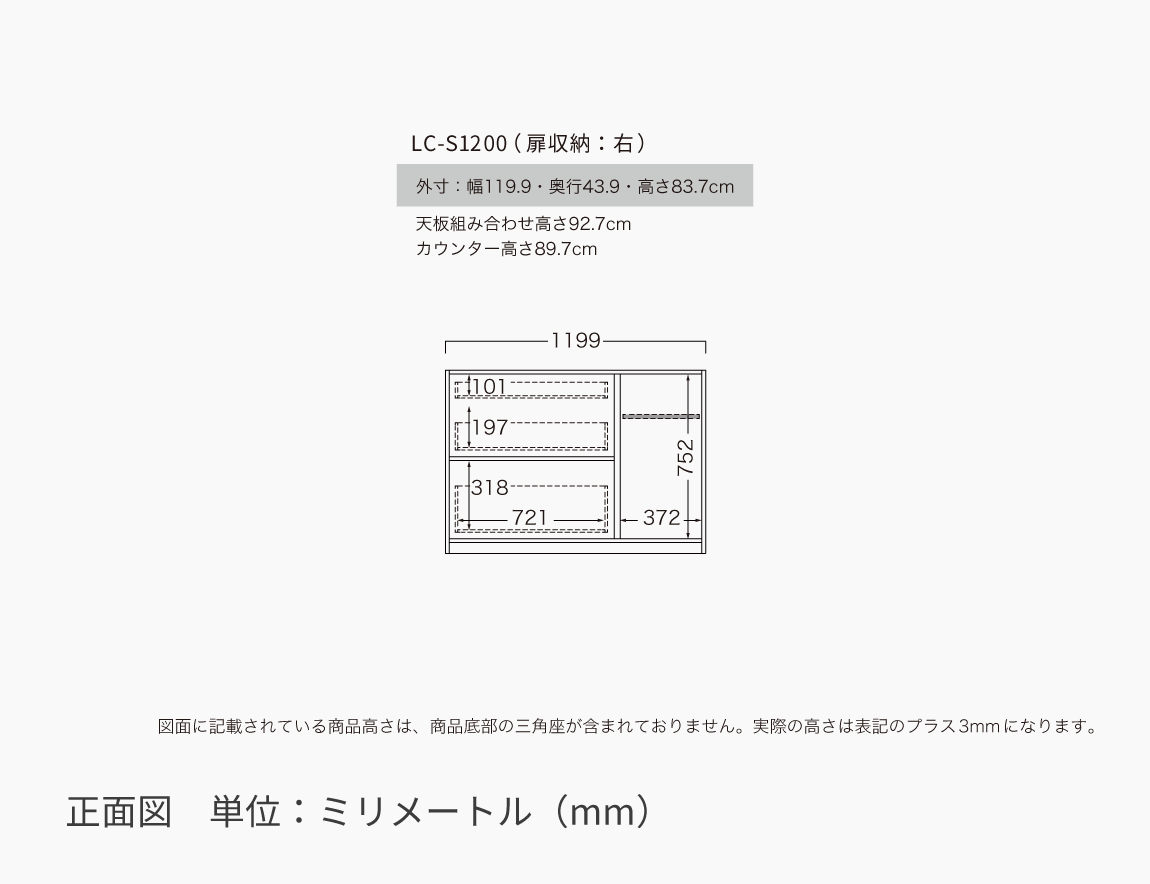 LCシリーズの幅60cm引収納、幅120cm引出+扉収納(右)、天板を組み合わせた幅180cmのキッチンカウンターです。