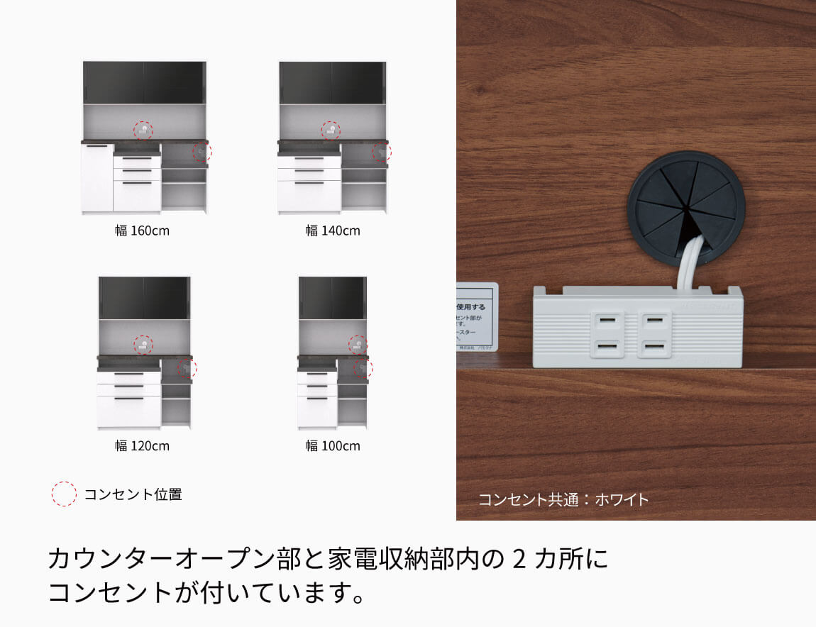 カウンターオープン部と家電収納部の2ヶ所に1500W2口のコンセントが設置されています。