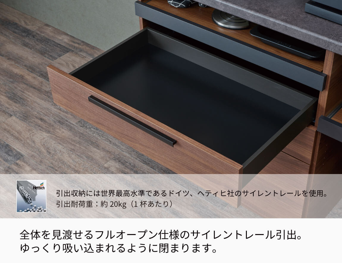 フルスライド仕様で引出の奥まで見渡せ、出し入れも簡単にできます。