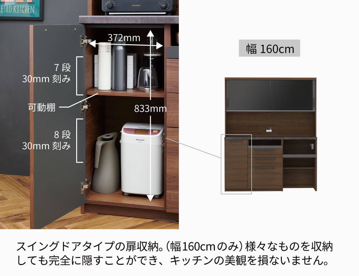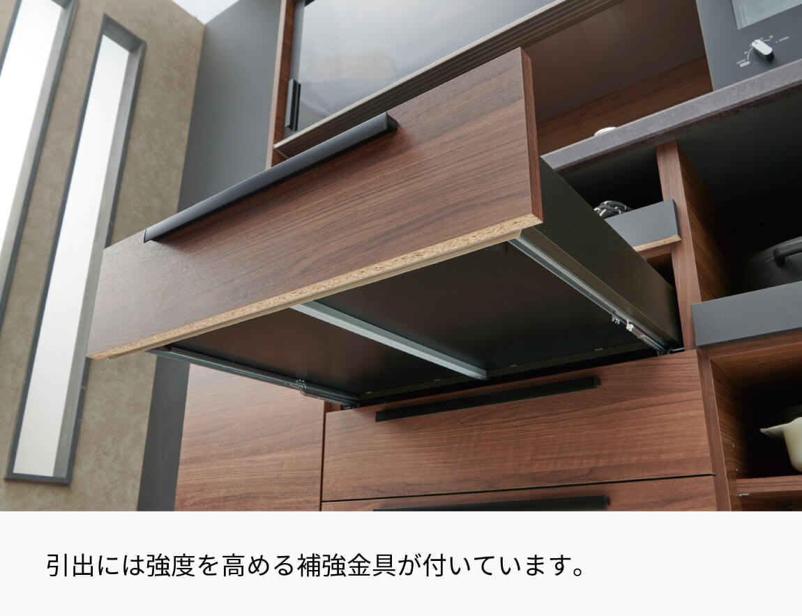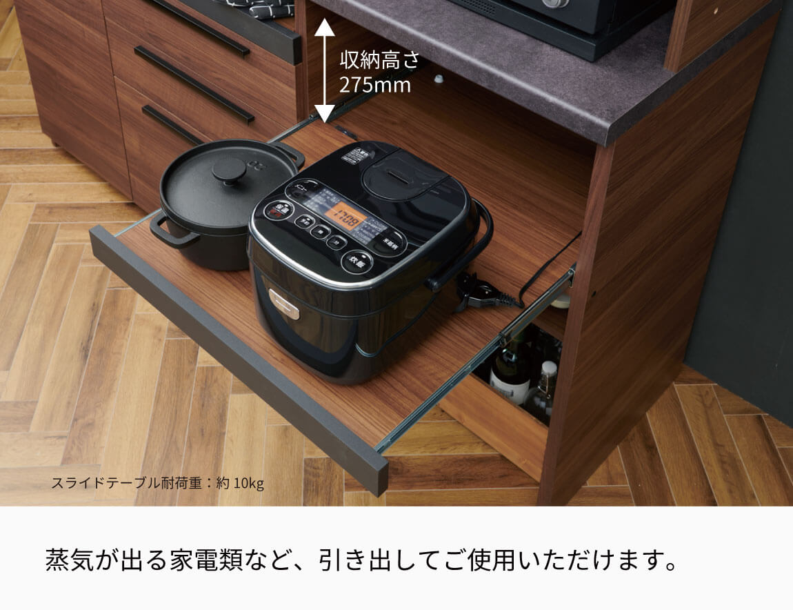 スライドテーブルになっているので、炊飯器などの蒸気の出る家電類を使いやすいところまで引き出してご使用いただけます。