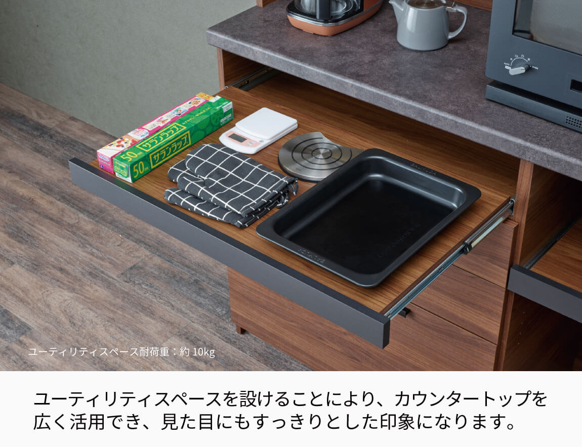 ミトンやラップ、レンジトレー等よく使うものをさっと出し入れできるユーティリティスペースを設けることにより、カウンタートップが広く使用でき、見た目もすっきりとした印象になります。