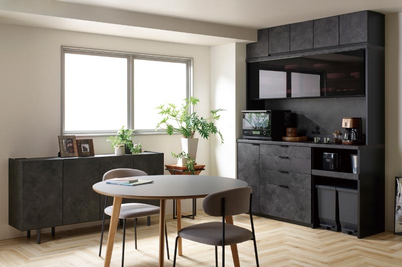 キッチン収納やTVボード、サイドボードなど様々な空間で使える幅広いアイテムを展開しており、石目調の表情が空間に奥行きを与え日常の暮らしに上質さをもたらします。